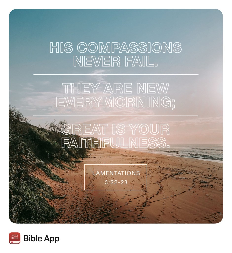 New beginnings remind of the characteristic of God that He is our new beginning. For each day that we are given, we have an opportunity to start fresh. Where we feel like we messed up, God gives us another chance. He forgives and guides us to become more like Him! Great is His faithfulness!