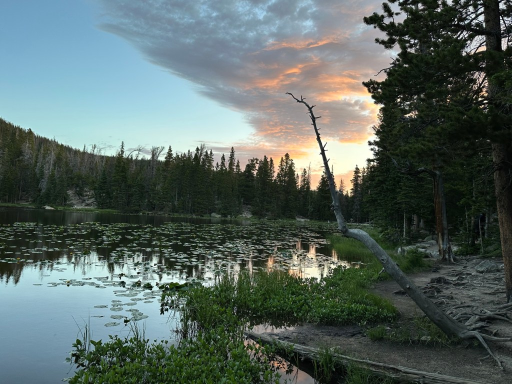 On a recent road trip, my husband and I wanted to see the sunrise at Bear Lake in Rocky Mountain National Park. We had to get there early to enter the park and hike to the site before the event. Since it was dark, we wore headlamps to show us where we were going. We arrived in time to see this spectacular vision.